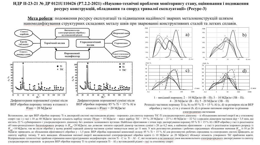 НДР II-23-21 № ДР 0121U110426 (Р7.2.2-2021) «Розробка наноструктурова-них модифікаторів для формування дрібнодисперсної структури металу зварних швів із конструкційних сталей та легких сплавів».