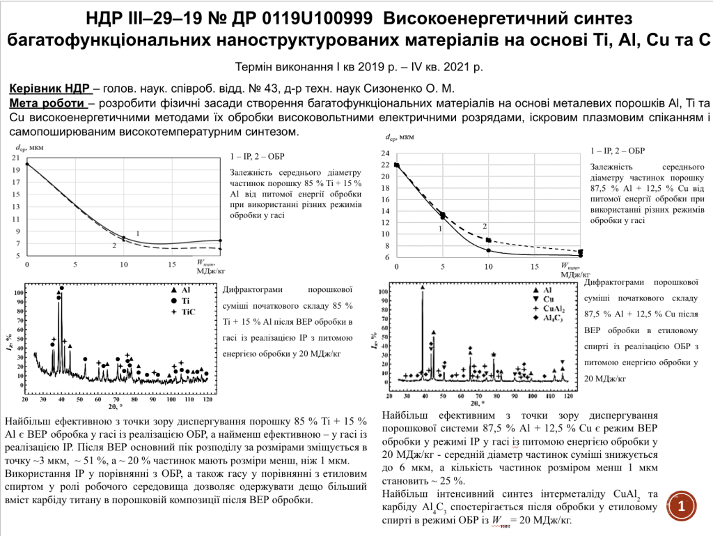 1. НДР III–29–19 № ДР 0119U100999 «Високоенергетичний синтез багатофункціональних наноструктурованих матеріалів на основі Ti, Al, Сu та С». Замовник Президія НАН України, термін виконання наукової роботи: початок 01.01 2019 р.; закінчення 31.12. 2021 р, науковий керівник Сизоненко Ольга Миколаївна, головний науковий співробітник, д.т.н., проф.