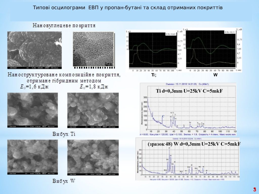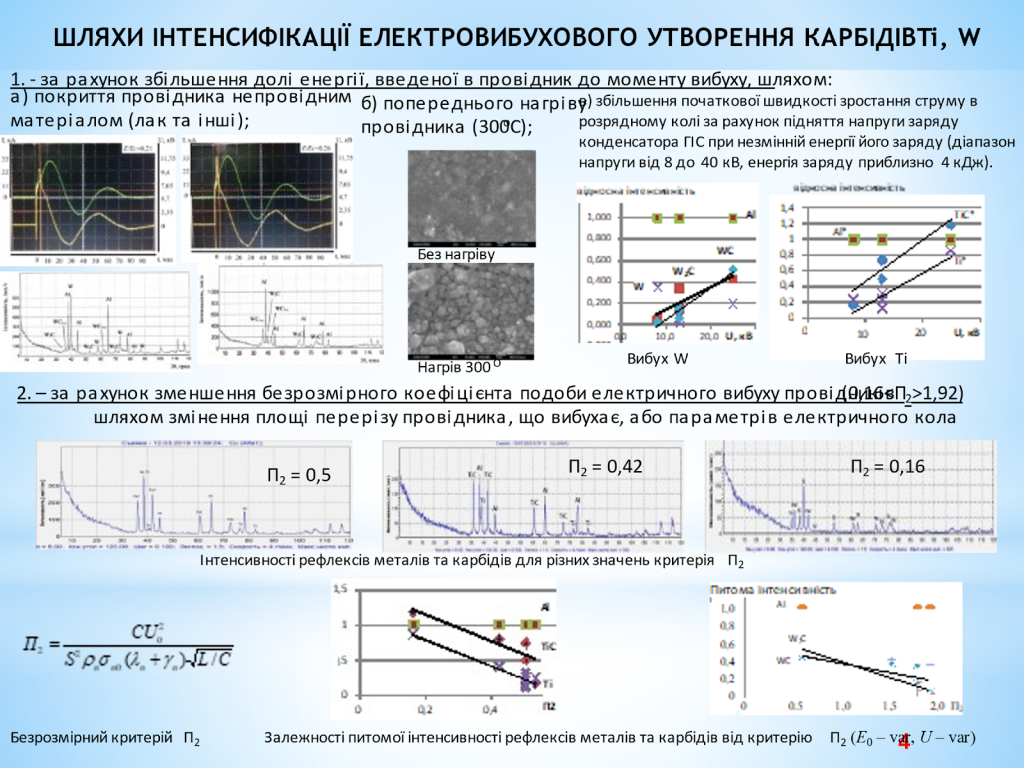 – Експериментально підтверджено можливість інтенсифікації утворення карбідів рефракторних металів (Ti, W) за рахунок збільшення долі енергії, введеної в провідник до моменту вибуху.