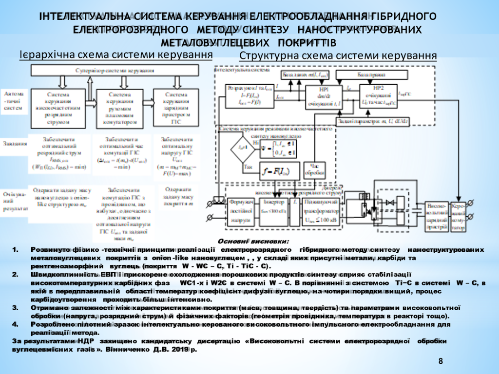 – Розроблено інтелектуальну систему керування потужного високовольтного електрообладнання гібридного типу з використанням нечітких регуляторів для гібридного методу синтезу композиційних покриттів.