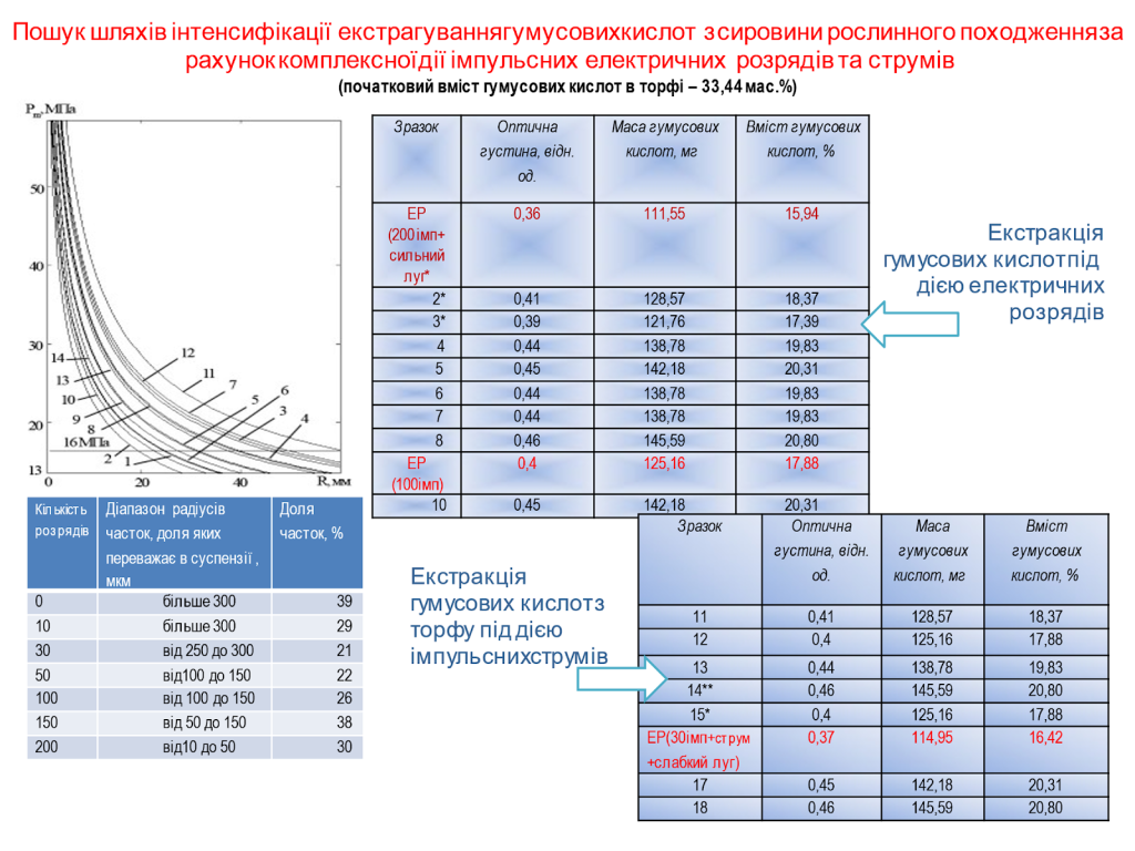 – Визначено, що результатами послідовного комплексного впливу високовольтних електророзрядних імпульсів та низьковольтного імпульсного струму на слаболужну суспензію «торф-воданатрію гідрокарбонат» є 30-кратне подрібнення часток твердого рослинного субстрату впритул до 10 мкм, приблизно 5-кратне зменшення вмісту бактерій і 2-3-кратне зменшення вмісту шкідливих грибкових організмів в торф’яних суспензіях, наостанок – підвищення кількості екстрагованих з торфу гумінових кислот до 17%.